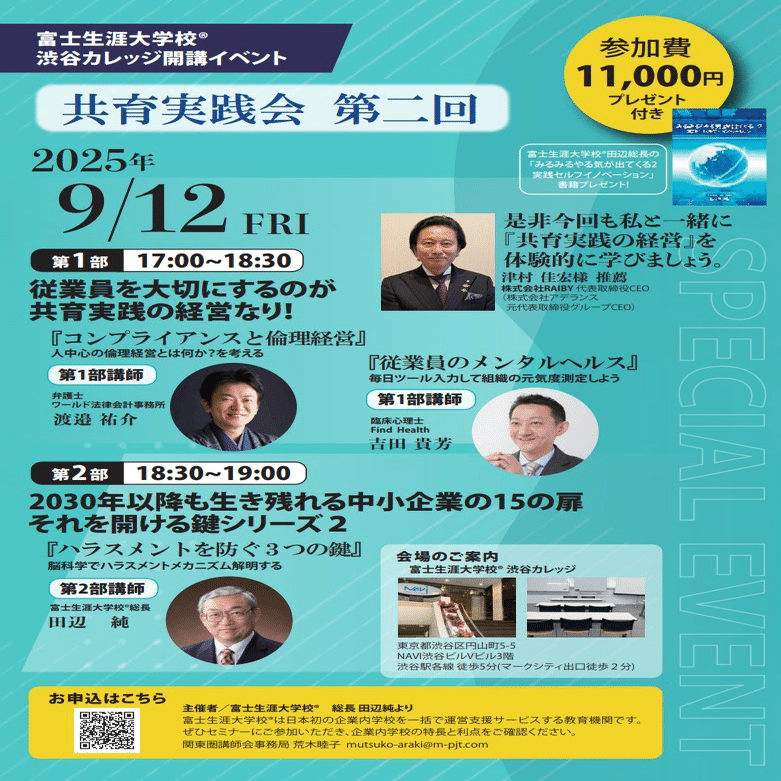 弁護士・渡邉祐介先生、富士生涯大学校®︎ 総長・田辺純先生とともに、
